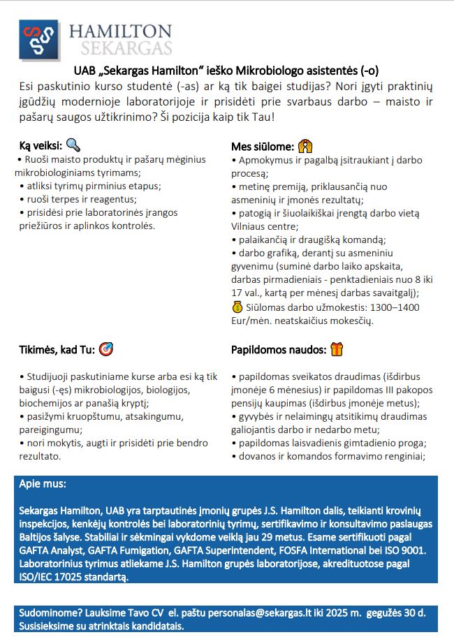 Geg 28 2025 Mikrobiologo asistentas(-ė) VIKOKarjeraNaujienosDarbo skelbimaiMikrobiologo asistentas(-ė)