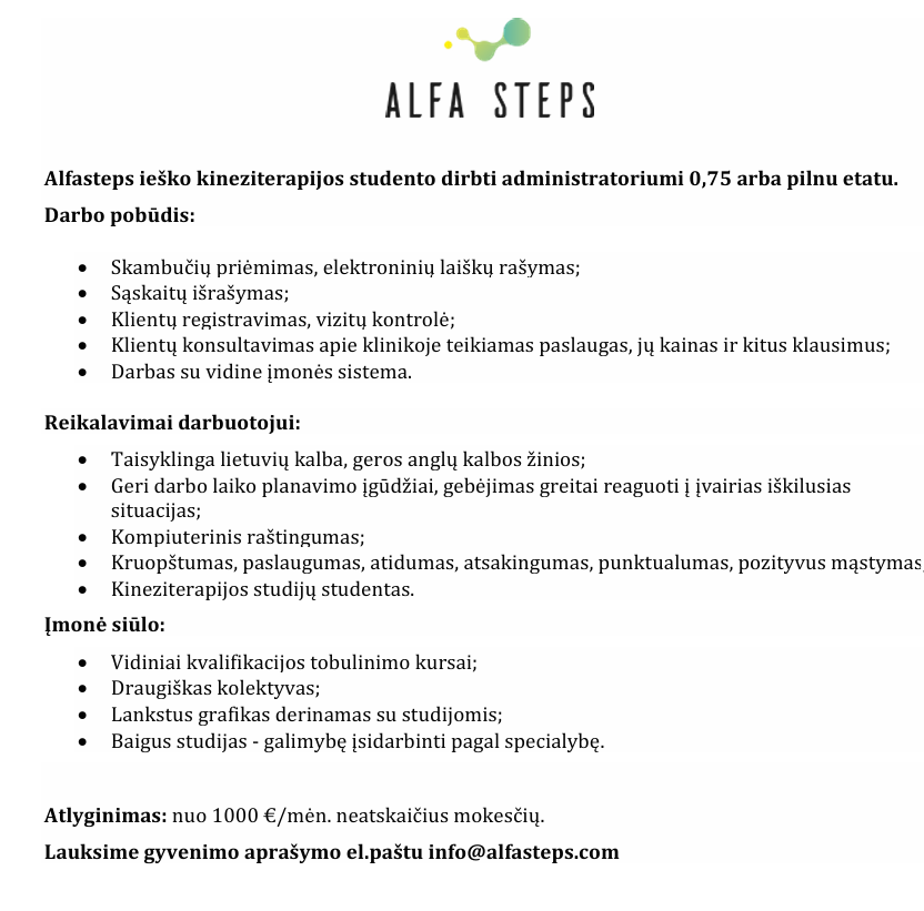 Darbo pasiūlymas Kineziterapijos studentui(-ei)