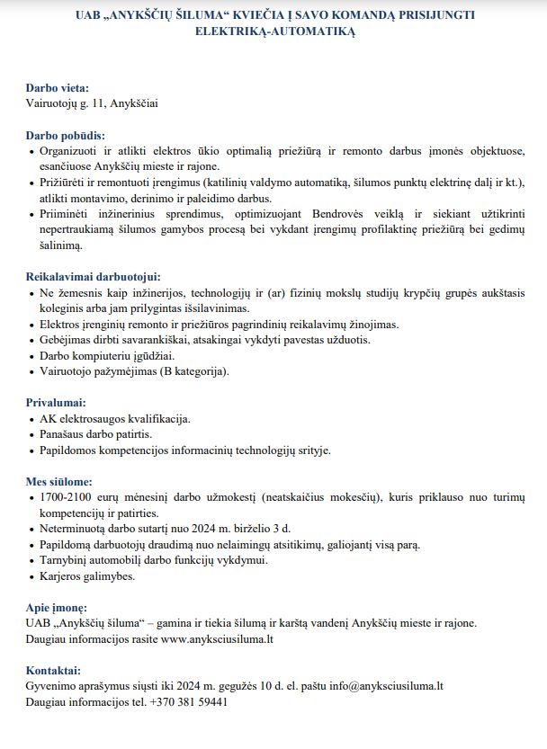 Elektrikas-automatikas (-ė). UAB „Anykščių šiluma“