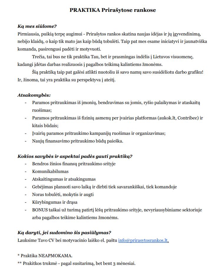 „Prirašytos rankos“ ieško praktikantės(-o), kuri(s) galėtų padėti finansų srityje. Nevyriausybinei organizacijai finansinė parama ir jos pritraukimas yra gyvybiškai reikalingi. Šioje praktikoje galėsi išmokti visko – nuo bendravimo su įmonėmis paramos klausimais iki paramos rinkimo kampanijų organizavimo. Sudomino?