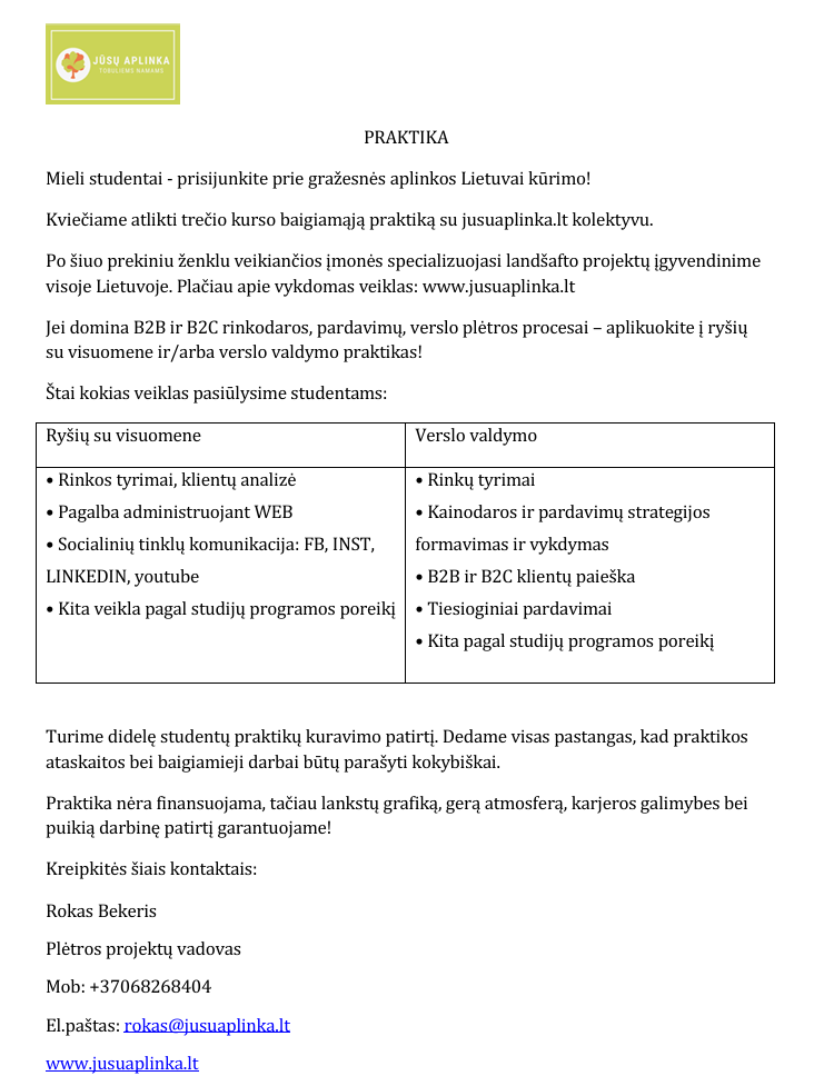 Praktika. Ryšiai su visuomene, verslo valdymas, rinkodara, pardavimai