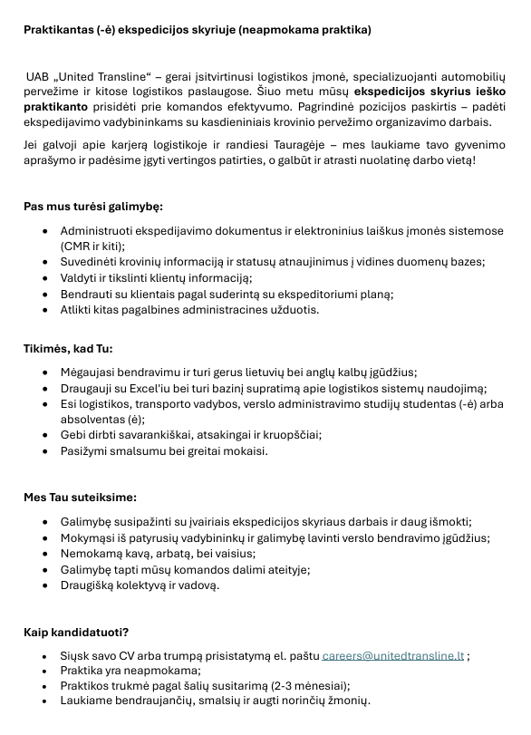 Praktikantas (-ė) ekspedicijos skyriuje (neapmokama praktika) Tauragėje