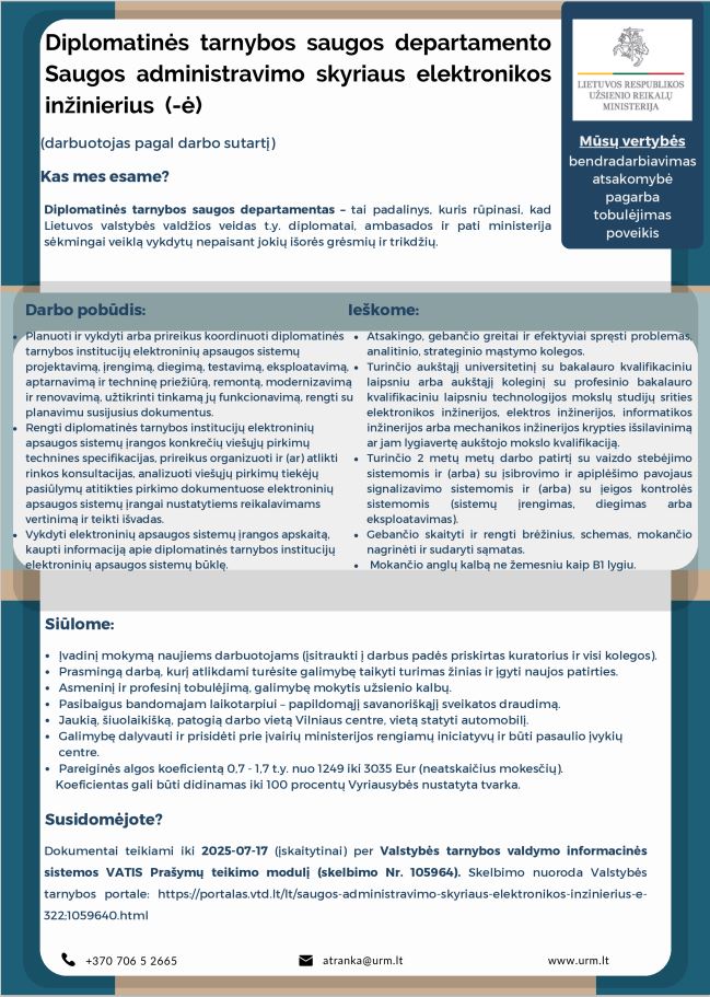 Saugos administravimo skyriaus elektronikos inžinierius (-ė)