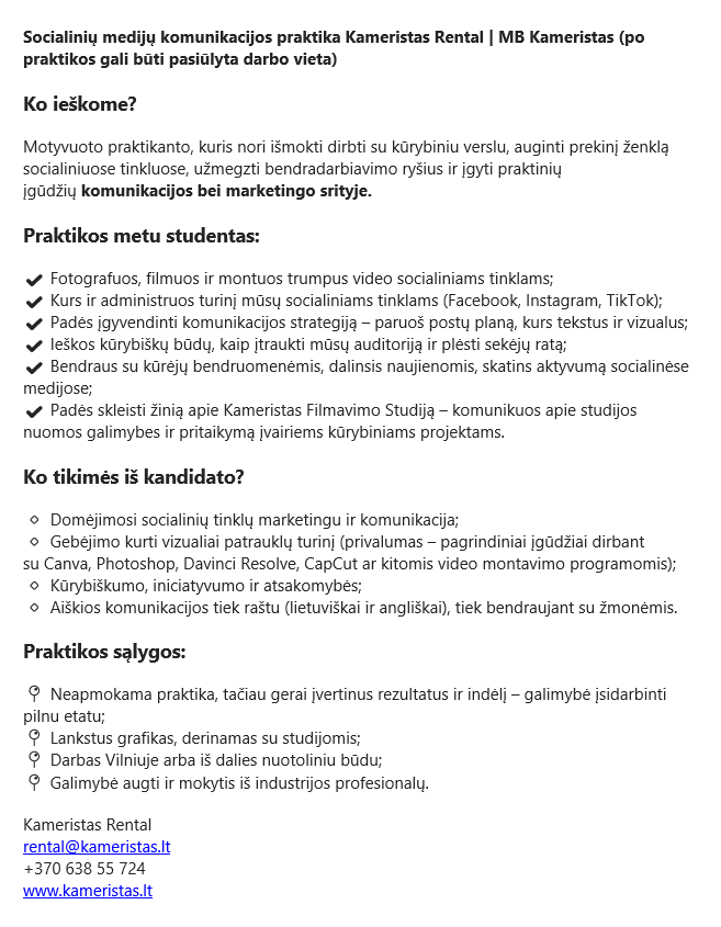 Socialinių medijų komunikacijos praktika. Kameristas Rental | MB Kameristas